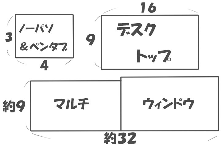 わかりにくいのでノーパソ、デスクトップ、今回のマルチ(デュアル)ディスプレイの比率を図にするとこんな感じ。