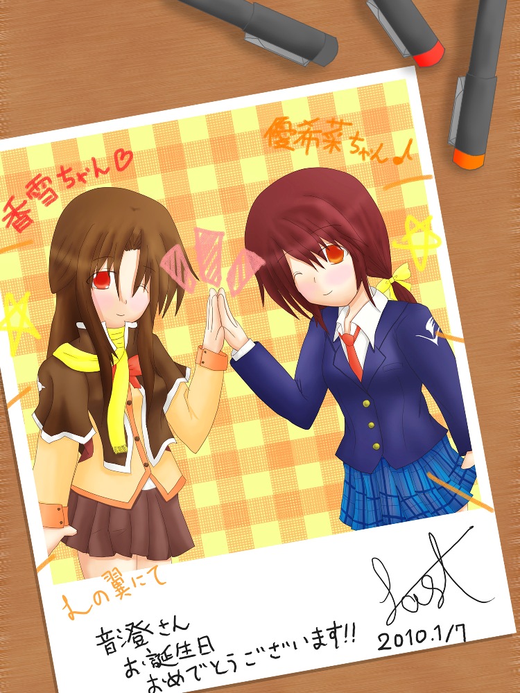 優希菜ちゃんにウチの制服。香雪に音澄さんちの制服のカラーリングがわからなかったのでこの前塗らせていただいた塗り絵の暖色ver.で塗らせていただきました。
